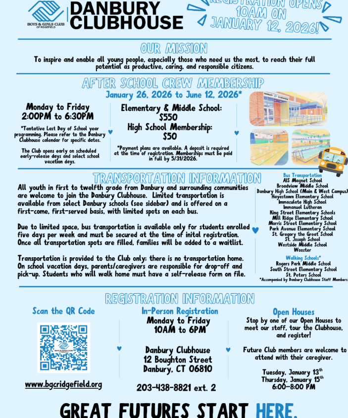 The Danbury Clubhouse, operated by the Boys & Girls Club of Ridgefield, is a dedicated youth development facility serving students in grades 1 through 12. It is designed to be a safe and supportive environment that focuses on growth, learning, and community connection beyond traditional after-school care.
